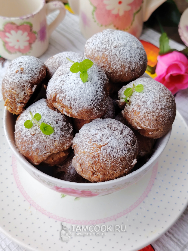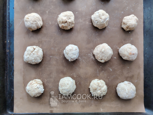 Отщипывая от теста небольшие кусочки, скатать шарики, чтобы они не прилипали к ладоням, заготовки можно обвалять в муке, выложить их на противень. Выпекать печенье при температуре 180 градусов около 25 минут.