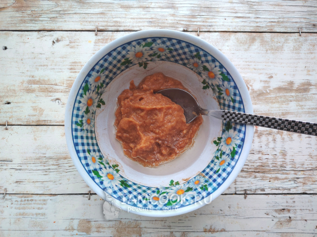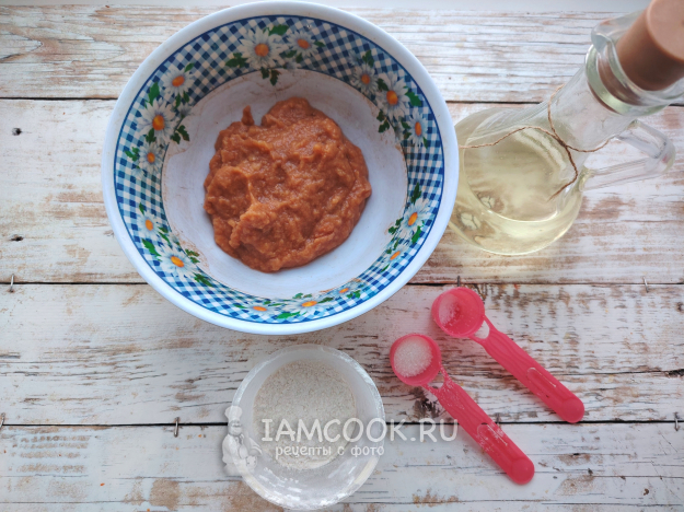 В яблочное пюре добавить сахар по вкусу, влить масло, перемешать. Для получения менее сладкой выпечки можно сахар не добавлять, яблочное пюре уже содержит природные сахара.