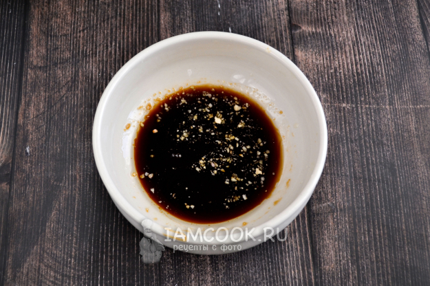 Для маринада смешайте в миске соевый соус, сушеный чеснок, лимонный сок, кунжутное масло.