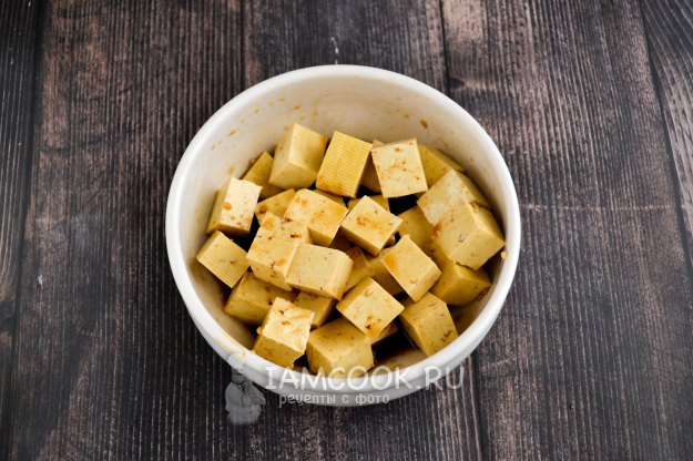 Отправьте в маринад нарезанный тофу. Перемешайте, чтобы кубики покрылись маринадом со всех сторон. Желательно оставить тофу в маринаде хотя бы на 15-20 минут, а можно и дольше.