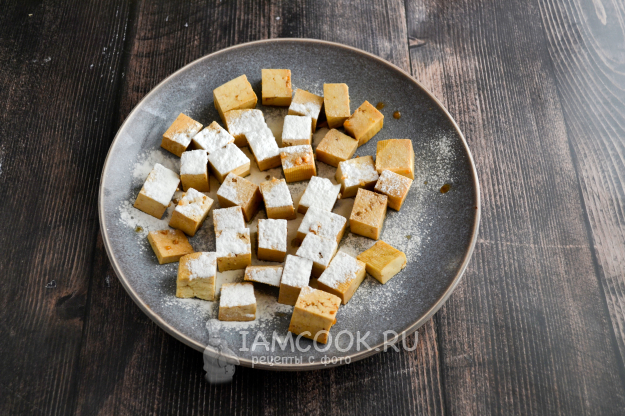 Маринад слейте, кубики тофу разложите на тарелку в один слой. Присыпьте кукурузным крахмалом, перемешайте, еще присыпьте, чтобы кубики были со всех сторон покрыты крахмалом.