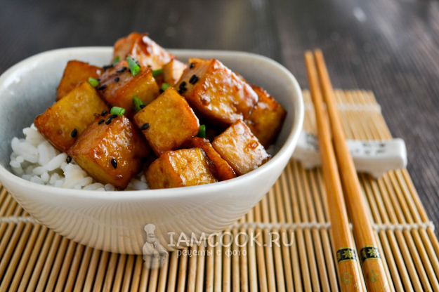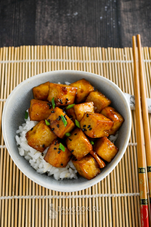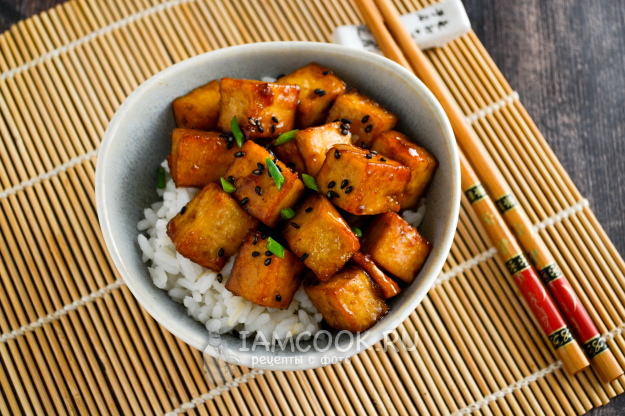 Жареный тофу по-китайски в медово-соевом соусе готов. Подавайте его с отварным рисом. Посыпьте кунжутом, зеленым луком.