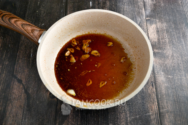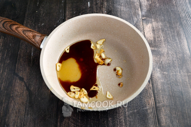 На растительном масле обжарьте нарезанный чеснок до легкой золотистой корочки. Положите в сковороду мед, влейте соевый соус, лимонный сок.