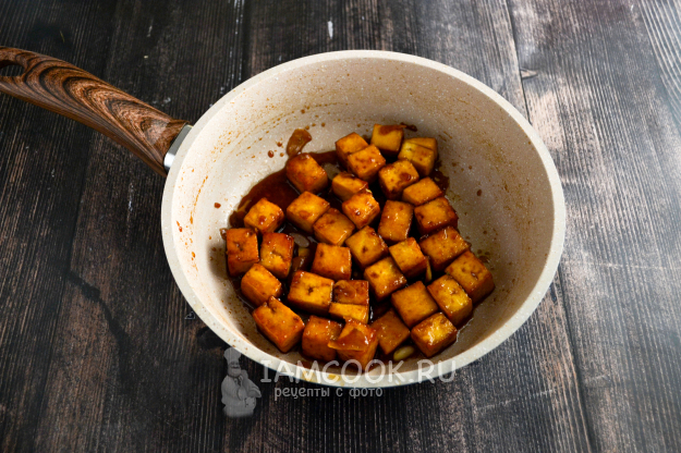 Перемешайте, чтобы кубики со всех сторон покрылись соусом. Постоянно перемешивая, обжарьте тофу несколько минут. Соус немного уварится, тофу покроется и пропитается соусом.