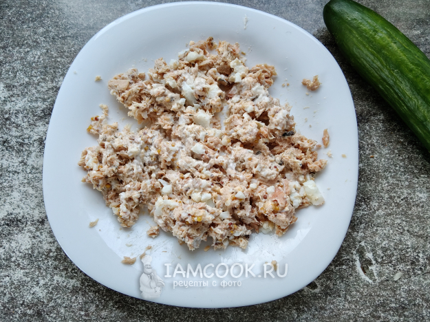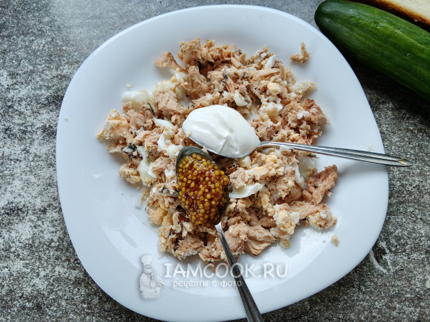 Очищенное яйцо и рыбу растереть вилкой.