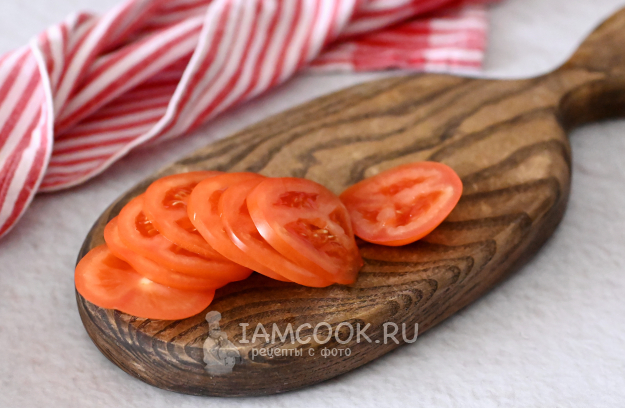 Также тоненько нарежьте помидоры.