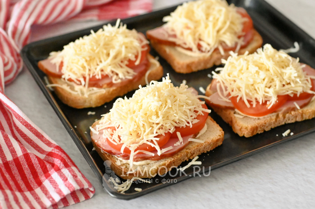 Увенчайте бутерброды щедрой горкой натёртого сыра и отправьте в разогретую до 220-250°С духовку на 3-5 минут.