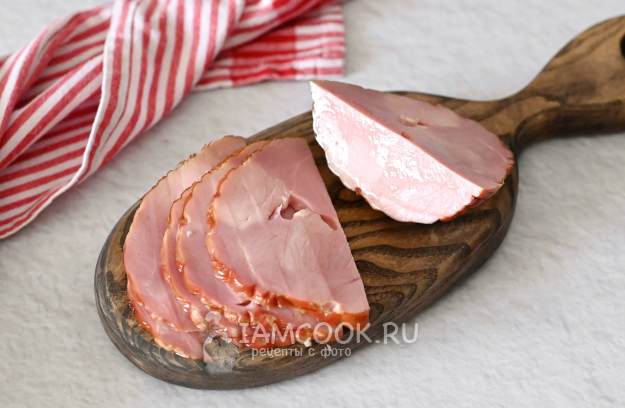 А вы тем временем нарежьте тонкими ломтиками копчёный окорок.
