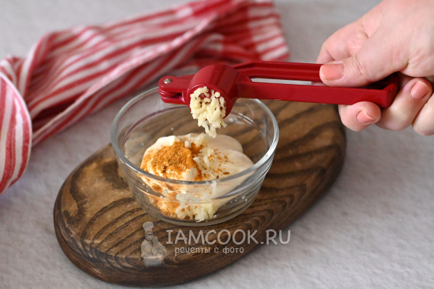 К майонезу добавьте специи для шашлыка и зубчик чеснока через пресс.