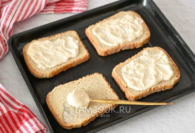 Ломтики хлеба выложите на противень и обильно смажьте майонезом с чесноком и специями.