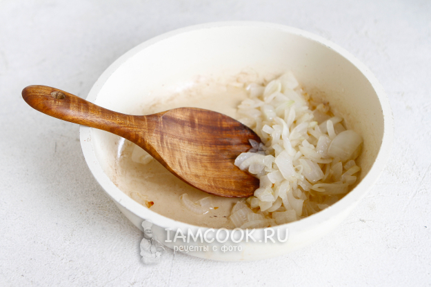 Почистите одну небольшую головку репчатого лука и нарежьте его. Разогрейте сковороду с растительным маслом. Обжарьте лук на среднем огне 3-5 минут.