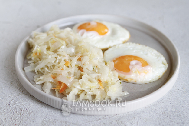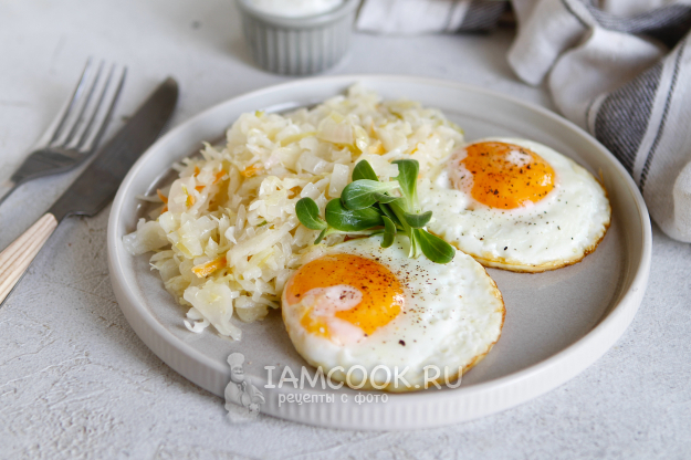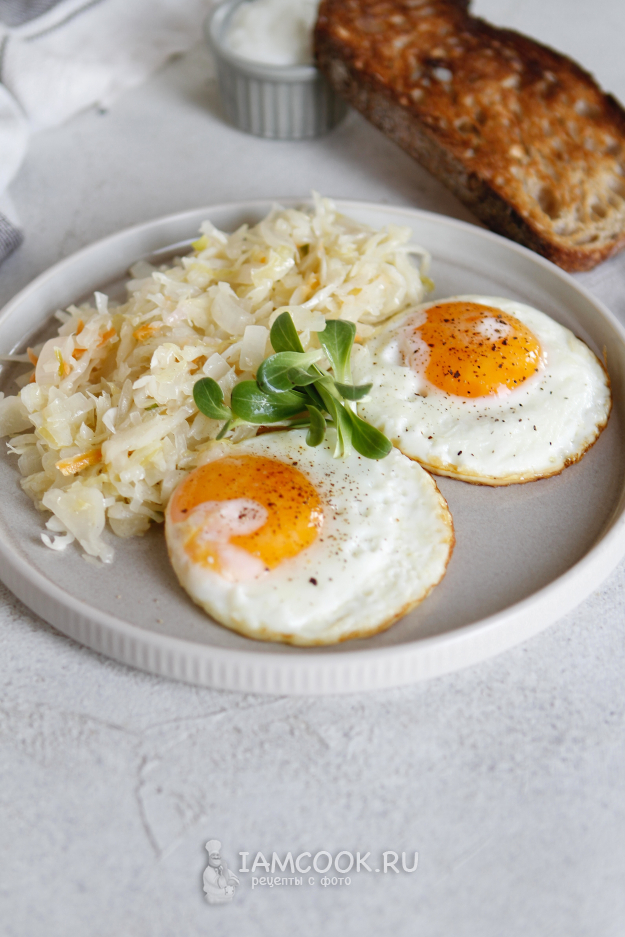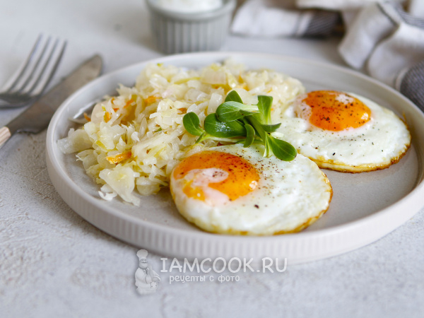 Можно сделать гнезда в капусте и пожарить яйца в них. Или приготовить яичницу болтунью.