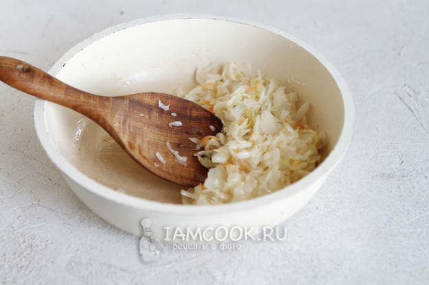 Квашеную капусту слегка отожмите от рассола и выложите в сковороду. Продолжайте обжаривать ее вместе с луком еще примерно 10 минут, до легкой золотистой корочки.
