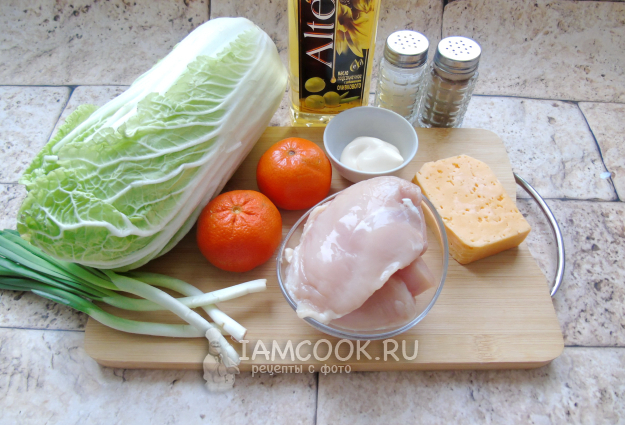 Соберите ингредиенты для приготовления салата с пекинской капустой, курицей и мандаринами.