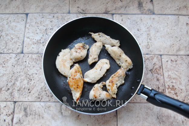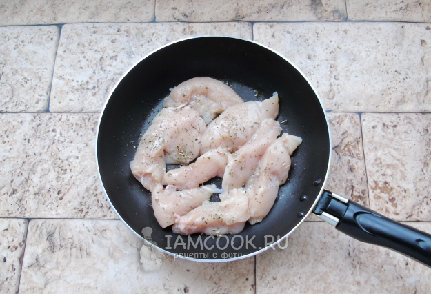 Куриное филе помойте и нарежьте произвольно. Посолите, поперчите и выложите в сковороду с растительным маслом.