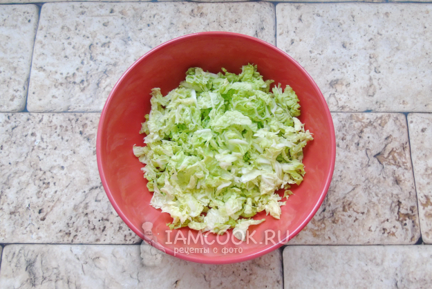 Пекинскую капусту мелко нарежьте, немного пожмите руками и выложите в салатник.