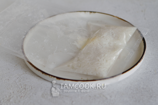 Приготовление риса методом су-вид - это мой личный эксперимент. Перечитала много советов по приготовлению круп таким способом. Рис хорошо промыла под проточной водой и откинула на дуршлаг. Уложила в пакет, добавила кусочек сливочного масла (5 г), слегка посолила и влила 60 мл воды. Завакуумировать рис с водой у меня не получилось от слова совсем.