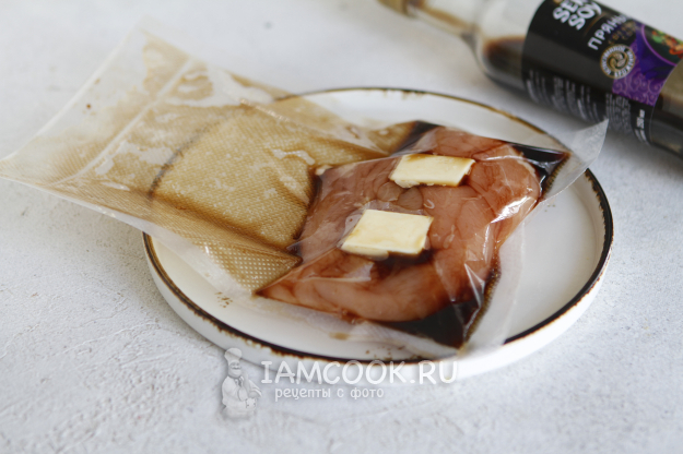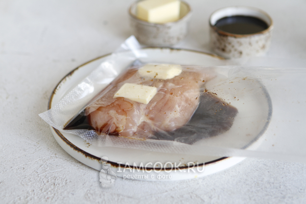 Куриное филе переложите в вакуумный пакет, добавьте 15 г сливочного масла и соевый соус.