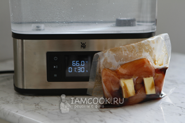 Когда вода нагреется до нужной температуры, опустите пакет с куриным филе и готовьте 1 час 30 минут.