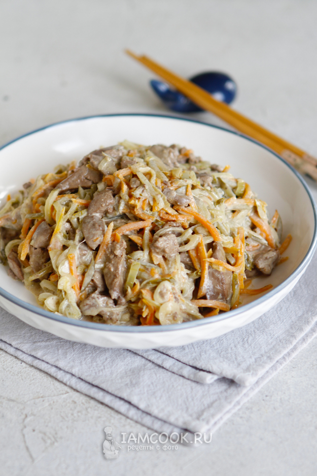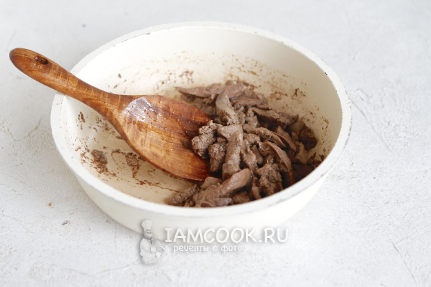 На этой же сковороде с 2 ст. л. растительного масла обжарьте печенку до готовности. Слегка посолите.