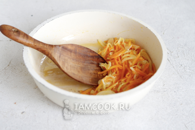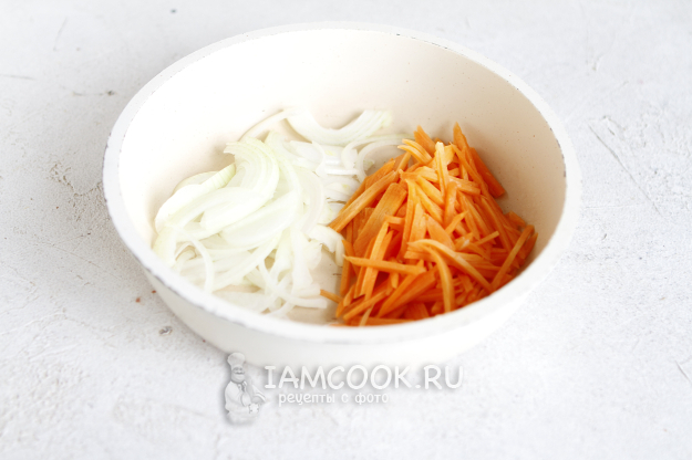 Почистите овощи. Лук нарежьте полукольцами, морковь - брусочками.