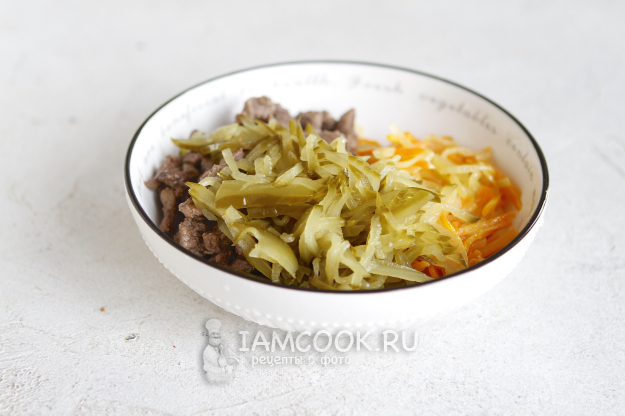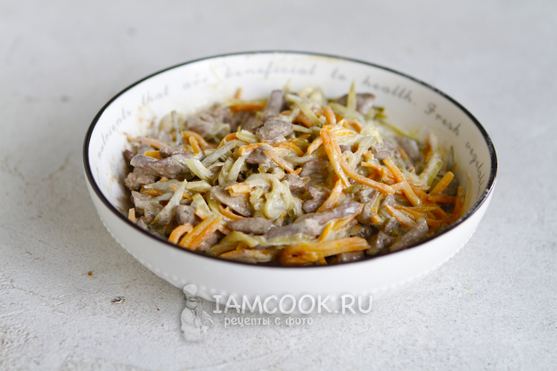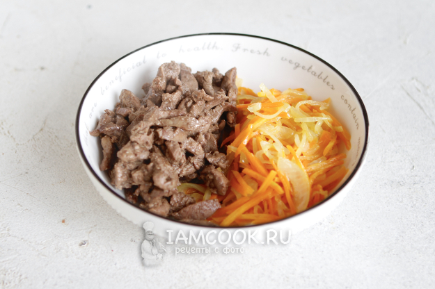 Переложите печенку в салатник к овощам.