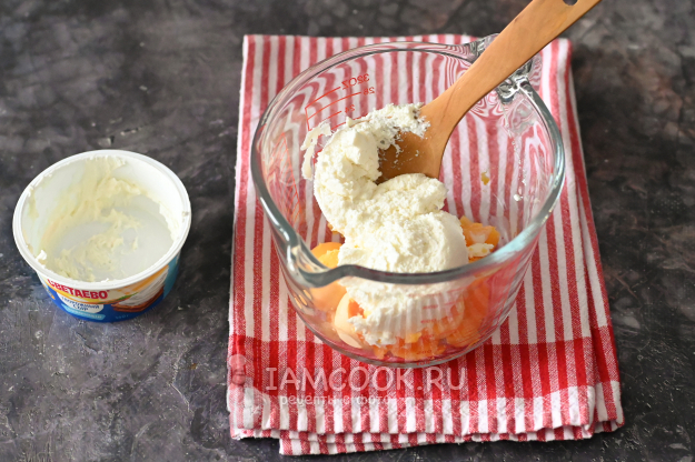 К яичным желткам добавьте творожный сыр.