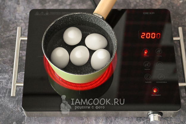 Яйца вымойте, сложите в ковш, залейте холодной водой и доведите до кипения. После закипания варите яйца 10 минут, затем залейте холодной водой.