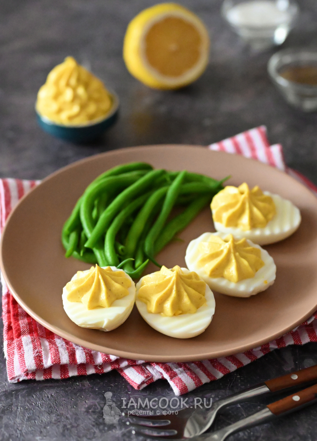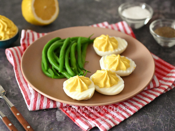 Фаршированные яйца без майонеза готовы. Подавать их можно в качестве самостоятельной закуски на праздничный стол.