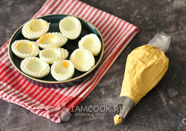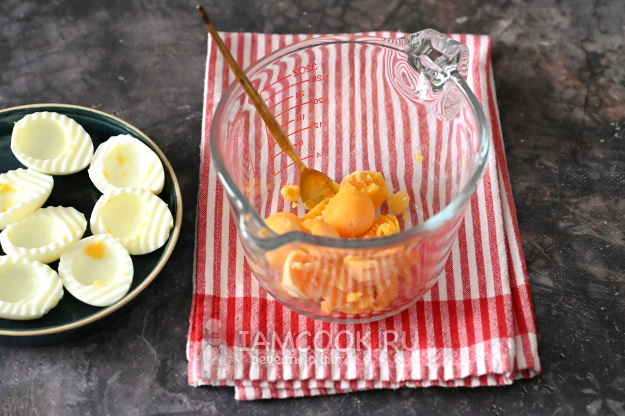 Из яиц аккуратно извлеките желтки, сложив в отдельную миску. А половинки яичных белков пока отставьте в сторонку.