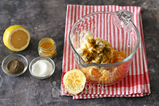 Приправьте будущую начинку солью, перцем, добавьте измельчённый чеснок, куркуму и немного лимонного сока.