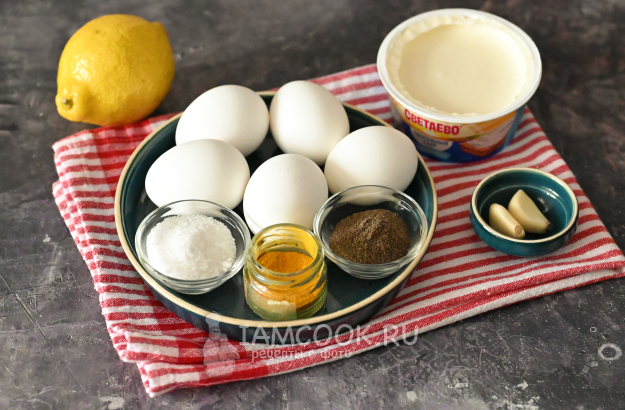Соберите необходимые продукты для приготовления фаршированных яиц без майонеза.