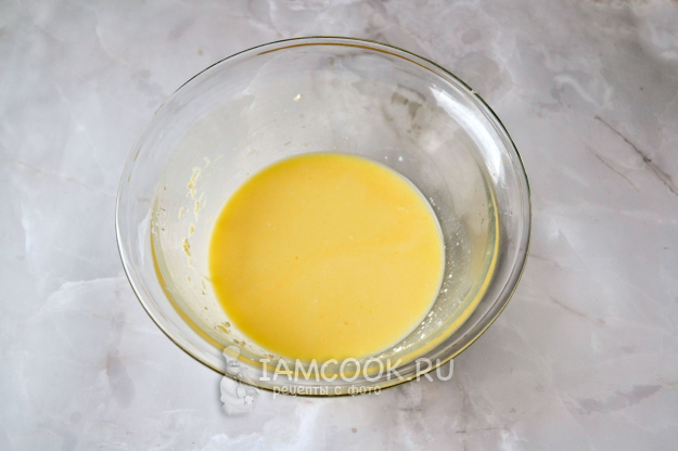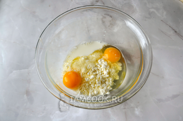 В миску положите творог, разбейте яйца, влейте молоко, добавьте соль.
