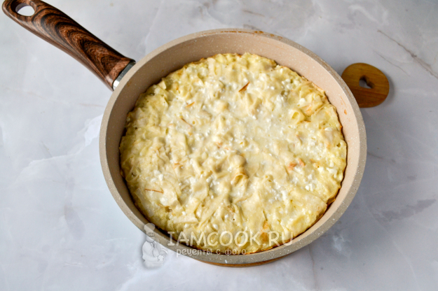 Готовьте рваный пирог из лаваша на сковороде примерно 20-25 минут. Проверьте донышко пирога, чуть приподняв его при помощи лопатки.