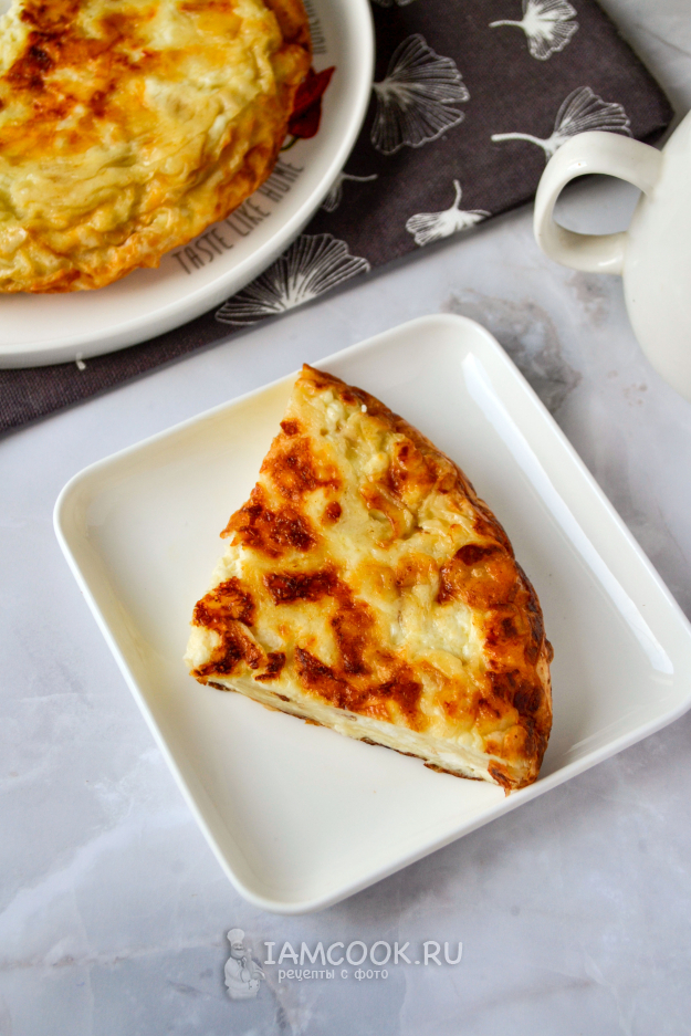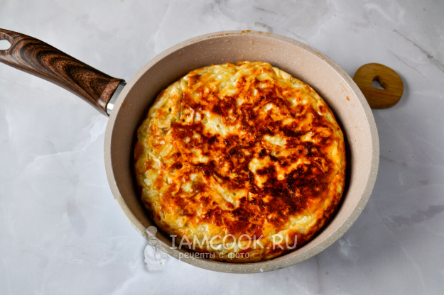 Если края пирога хорошо отходят от сковороды и донышко румяное, накройте пирог плоской тарелкой и переверните сковороду. Затем верните пирог в сковороду, чтобы допеклась верхняя сторона пирога, примерно 10-12 минут.