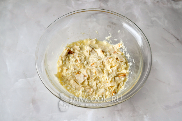 Перемешайте, чтобы все кусочки лаваша были покрыты жидким тестом. Оставьте массу на 10 минут, чтобы лаваш немного пропитался жидкостью.