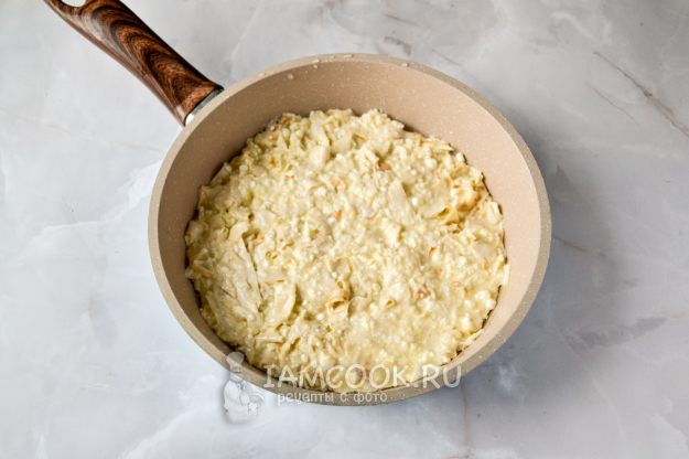 На сковороду налейте растительное масло и выложите тесто. Поверхность разровняйте лопаткой. Поставьте сковороду на самый тихий огонь, закройте крышкой.