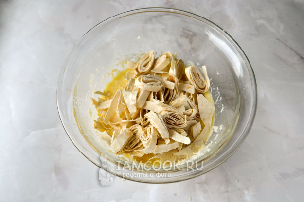 Лаваш сверните трубочкой и нарежьте тонкими лентами в миску. Или порвите лаваш руками на небольшие кусочки.