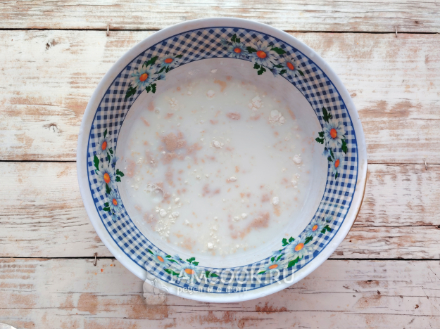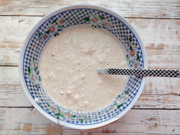 Начать с приготовления теста. В миске с теплым молоком растворить сахар, добавить дрожжи и столовую ложку муки, размешать и оставить на 15 минут возле батареи или ином теплом месте, чтобы дрожжи активизировались.