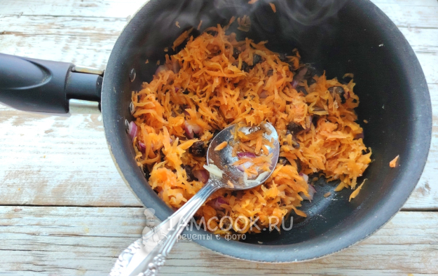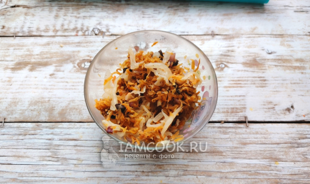 Соединить капусту с грибной зажаркой. Перемешать, дать остыть начинке.
