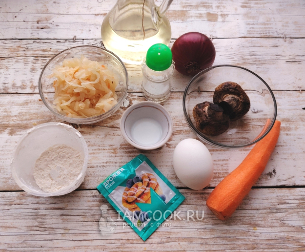 Собрать по списку продукты для приготовления пирожков с квашеной капустой и грибами в духовке.