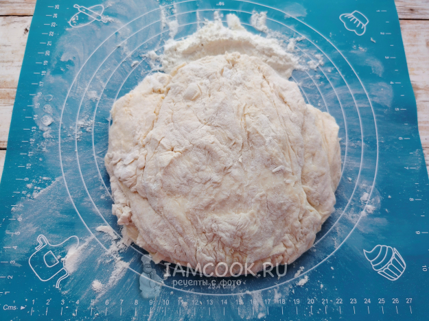 Тесто выложить на коврик, подсыпанный мукой, подмесить, чтобы оно не прилипало к ладоням.
