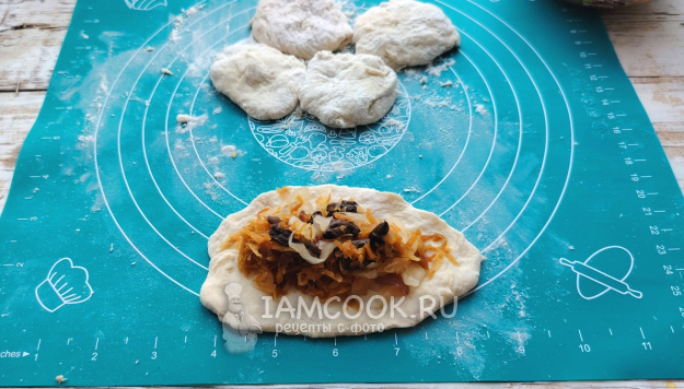 Разделить тесто на кусочки, каждый раскатать скалкой или растянуть руками в небольшую лепешку. Наполнить заготовку начинкой, скрепить края пирожка.
