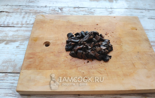 Пока выстаивается тесто, подготовить начинку. Грибы можно использовать свежие или замороженные. Промыть их и мелко порубить ножом.