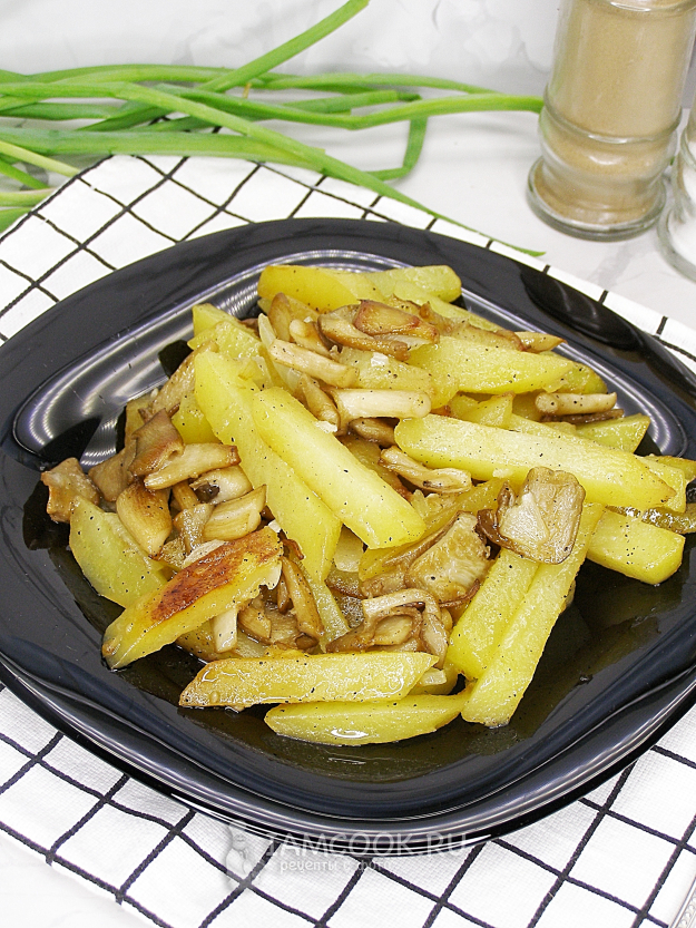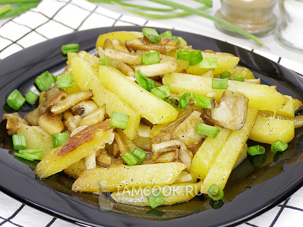 Жареная картошка с вешенками готова! Подаём к столу в горячем виде, добавив свежую зелень. Приятного аппетита!