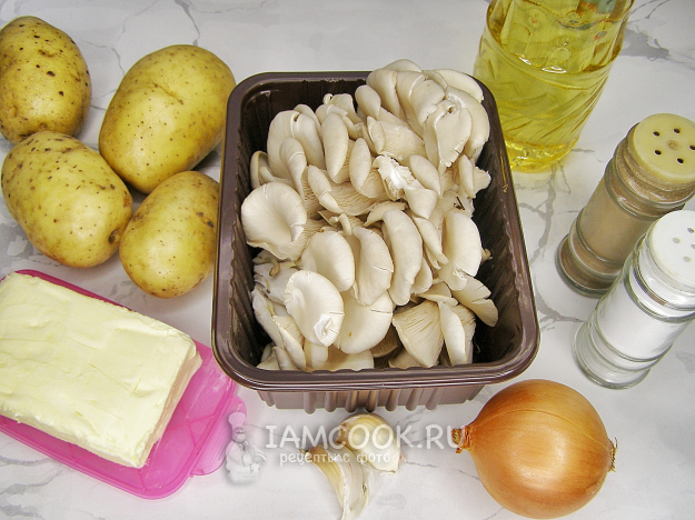 Соберём необходимые продукты для приготовления жареной картошки с вешенками на сковороде.