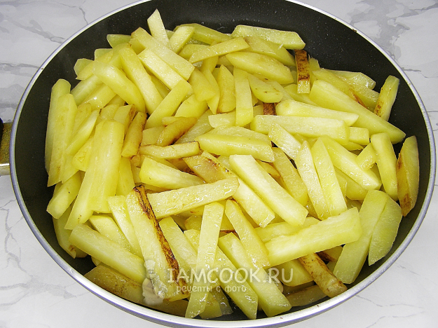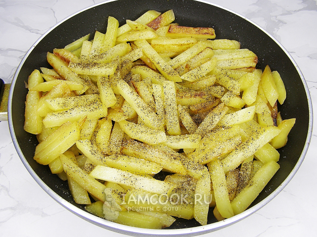 Широкой лопаткой переворачиваем картофель. Старайтесь сделать это аккуратно, чтобы брусочки не поломались. Жарим ещё минут 10, не перемешивая и не накрывая крышкой.