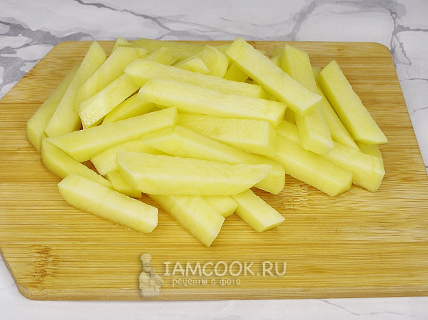 Картофель чистим и нарезаем брусочками толщиной примерно 1 см. Нарезанную картошку перекладываем в кастрюлю с холодной водой.