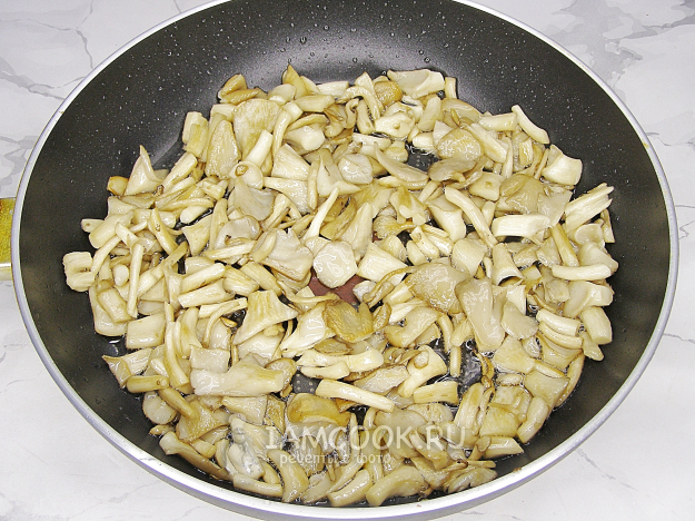 В сковородку наливаем растительное масло, разогреваем и в горячее масло выкладываем вешенки. Обжариваем на сильном огне 2-3 минуты, периодически перемешивая, затем уменьшаем огонь до среднего и жарим ещё примерно 10 минут.