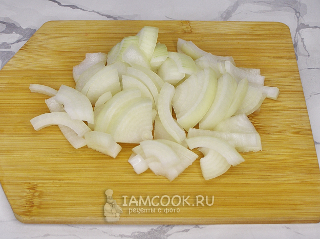 Очищенную луковицу нарезаем полукольцами или четвертинками колец.